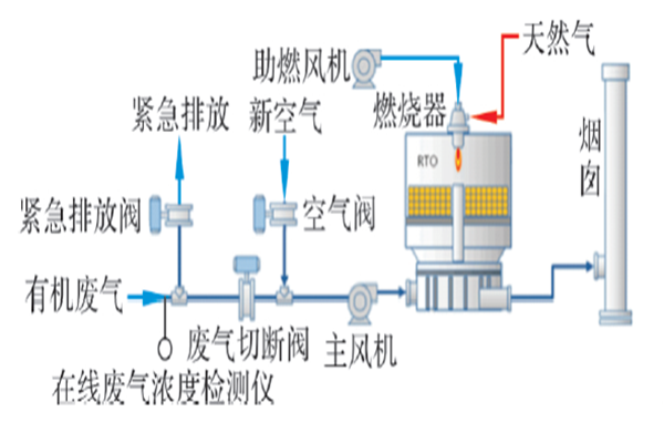 3、为降低爆炸风险,VOCs有机废气处理RTO设备应增加相应的逻辑控制,即当检测到高浓度气体时,RTO装置触发联锁停车,即废气紧急排放阀打开,废气切断阀关闭,新鲜空气阀门打开,主风机降低风量运行,确保炉内一直进入较低浓度的气体。
