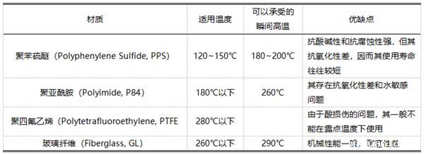 布袋除尘器的核心是滤袋材料。目前,滤袋主要材质包括聚苯硫醚(Polyphenylene Sulfide, PPS)、聚亚酰胺(Polyimide, P84)、聚四氟乙烯(Polytetrafluoroethylene, PTFE)和玻璃纤维(Fiberglass, GL)等。各种材质的适用温度与优缺点详见表1。为了更好融合各种滤袋材质的优点,克服各种滤袋材质的缺点,由两种或多种材质组成的复合型滤袋也较为常见。