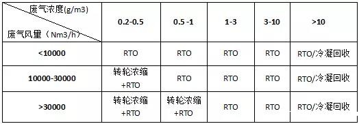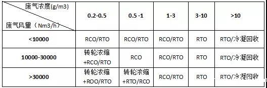 在废气风量、废气浓度和成分知晓的情况下,可以选择相应的处理方式,可以参照下表进行选择(仅供参考):