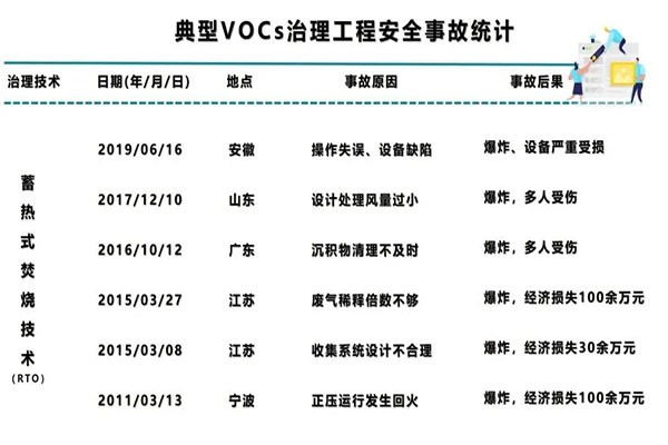 目前,RTO设备因VOCs有机废气处理效率高、治理效果彻底而广泛被应用在各行各业中。但是,如果VOCs有机废气设备操作不当,就会出现一些安全问题,近几年RTO爆炸的典型案例如图: