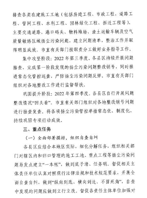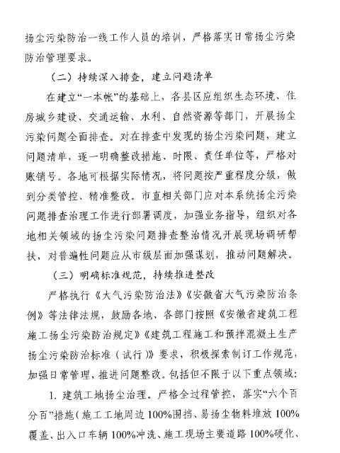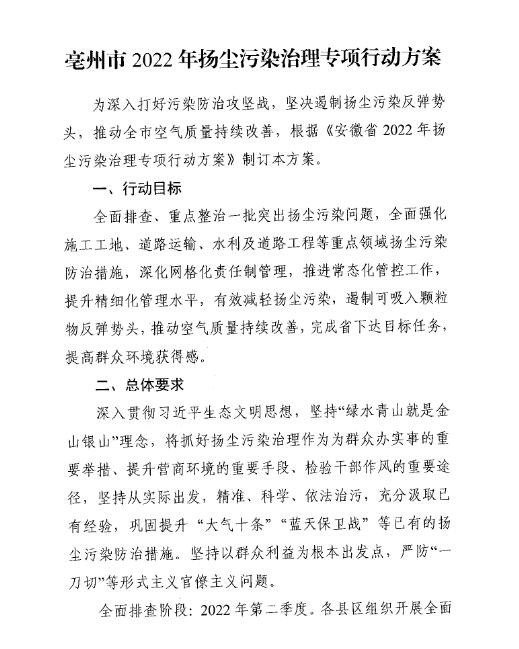 日前,亳州发布《亳州市2022年扬尘污染治理专项行动方案》。旨在深入打好污染防治攻坚战,遏制扬尘污染,持续改善空气质量。详情如下: